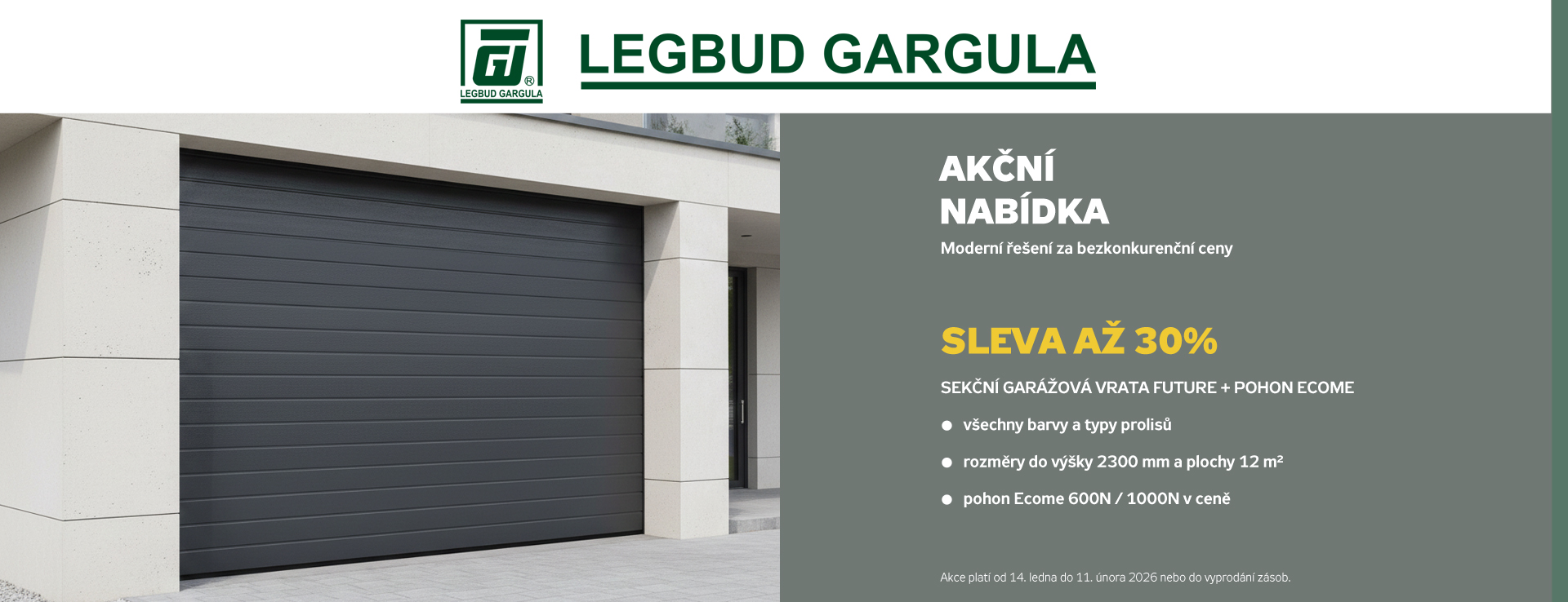 S potěšením vás informujeme, že jsme zpřístupnili internetový obchod s nabídkou produktů LEGBUD GARGULA dostupných online. Nabízíme výklopná a sekční garážová vrata s dodáním k zákazníkovi, stejně jako náhradní díly a komponenty pro brány.