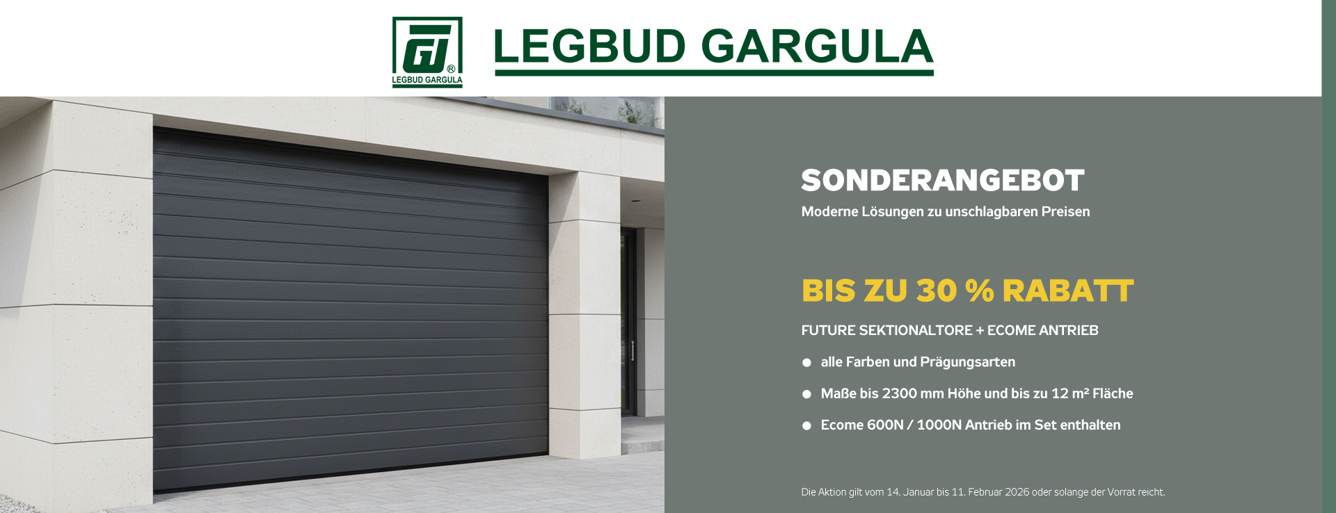 Wir freuen uns, Ihnen unseren Onlineshop mit dem Angebot von LEGBUD GARGULA-Produkten zur Verfügung zu stellen. Wir bieten Schwing- und Sektionaltore mit Lieferung an den Kunden sowie Ersatzteile und Komponenten für Tore.
